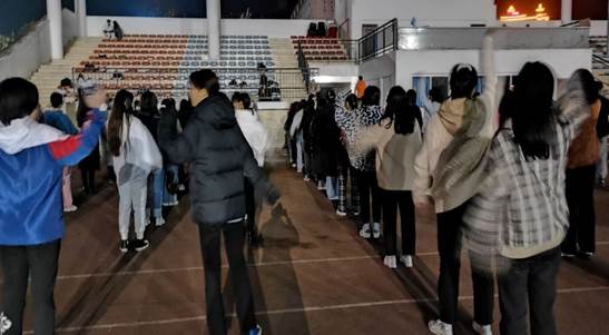 晚上九点整,由活动部进行组织和指挥,自律委全体成员在主席台前集合,随后各部门部长进行部门考勤,进行跑前热身运动,最后开始了有序的夜跑活动。