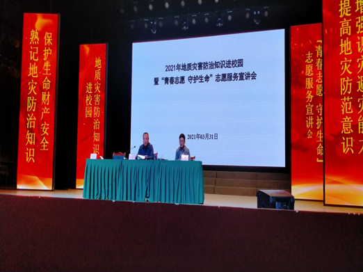 【本网讯】为提高地质灾害防范意识和增强识灾避灾能力,营造“地质灾害人人参与”的良好氛围。我校于2021年3月31日下午2:00在南苑剧场开展地质灾害防治知识培训会。参加本次会议的领导有阿坝州自然资源局的党组成员、总工程师石强同志,中共青年团阿坝州委员会李为玺老师,中国科学院水利部、成都山地灾害与环境研究所博士刘维明同志,汶川县自然资源局李双全同志,参会同学有我校校学生会、学生社团联合会、校学生自律委员会、19级和20级地理科学全体学生和各二级学院权益部、各班生活委员。