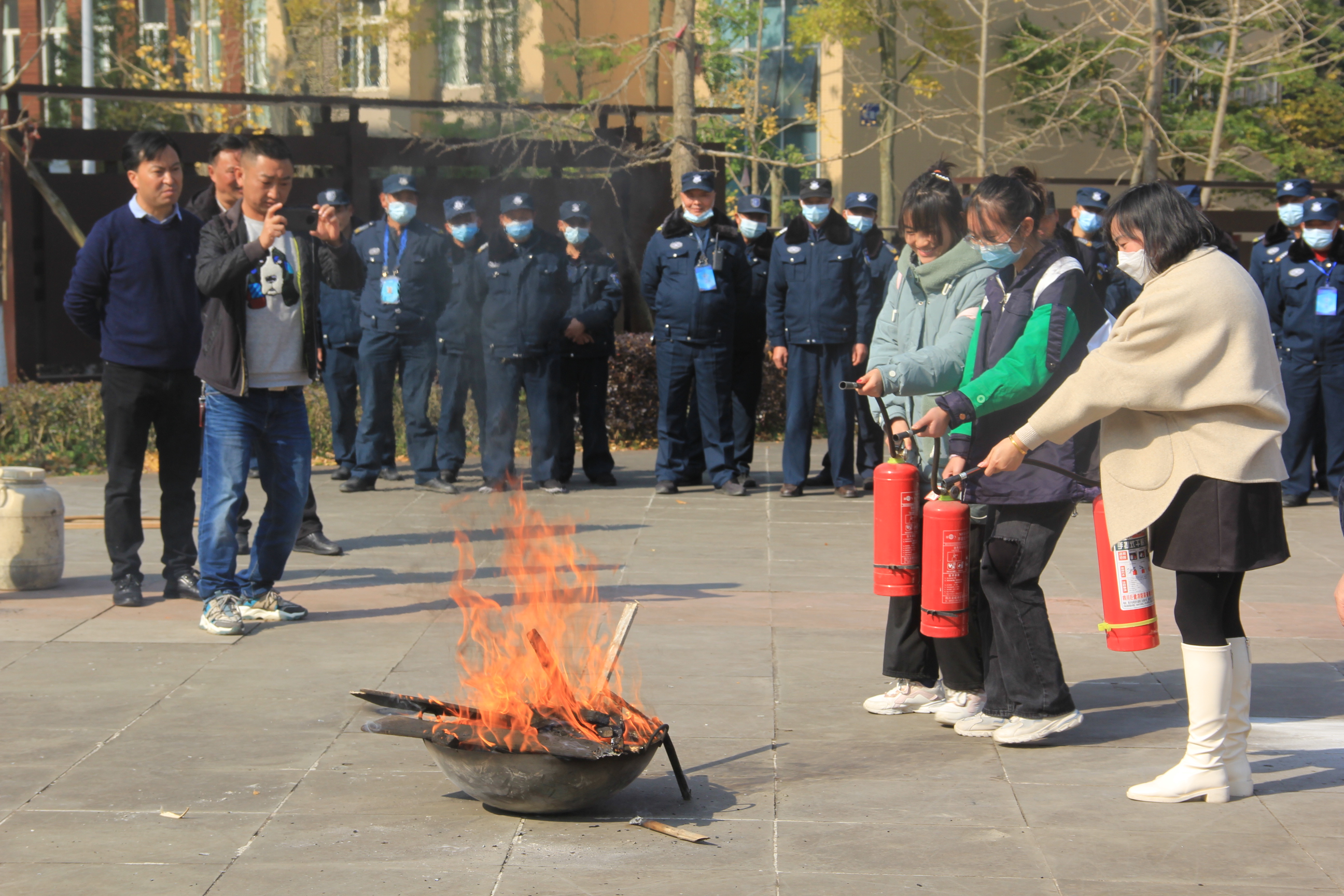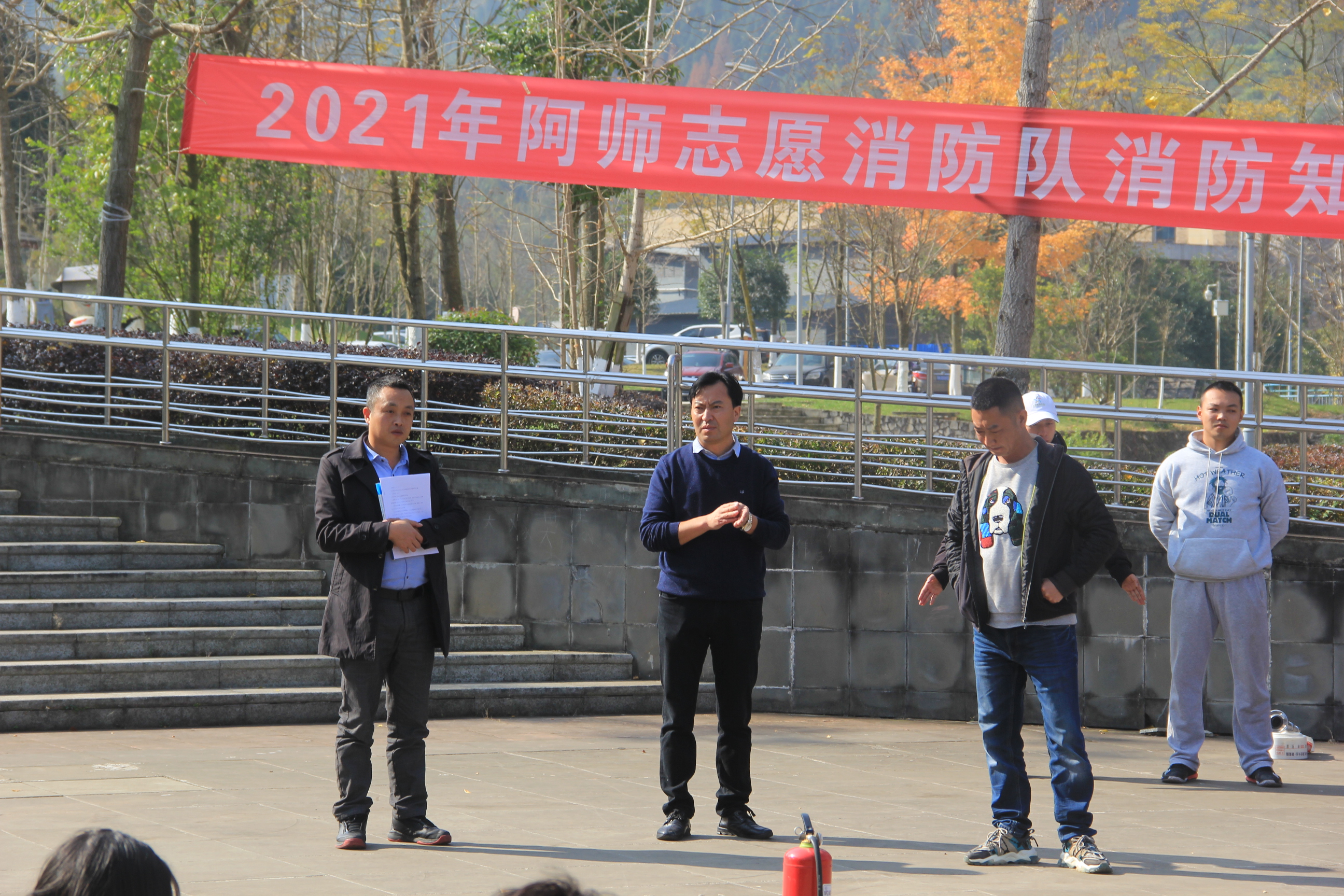 【本网讯】为贯彻落实《关于推进消防安全宣传教育进机关进学校进社区进企业进农村进家庭进网站工作的指导意见》,进一步提高学生干部与校园工作人员消防安全意识,增强消防法制观念,提升防火灭火技能,强化消防安全管理,助力平安校园建设。2021年11月15日中午12:20,由自律委员会全体成员、民兵应急排,安保人员和宿舍各管理人员组成的阿师志愿消防队在枫叶广场开展了志愿消防队消防知识技能培训,本次培训由保卫处副处长杨友国带领,保卫处老师杨锐、马毅、孙麟,校自律委指导老师王林波到场参与。