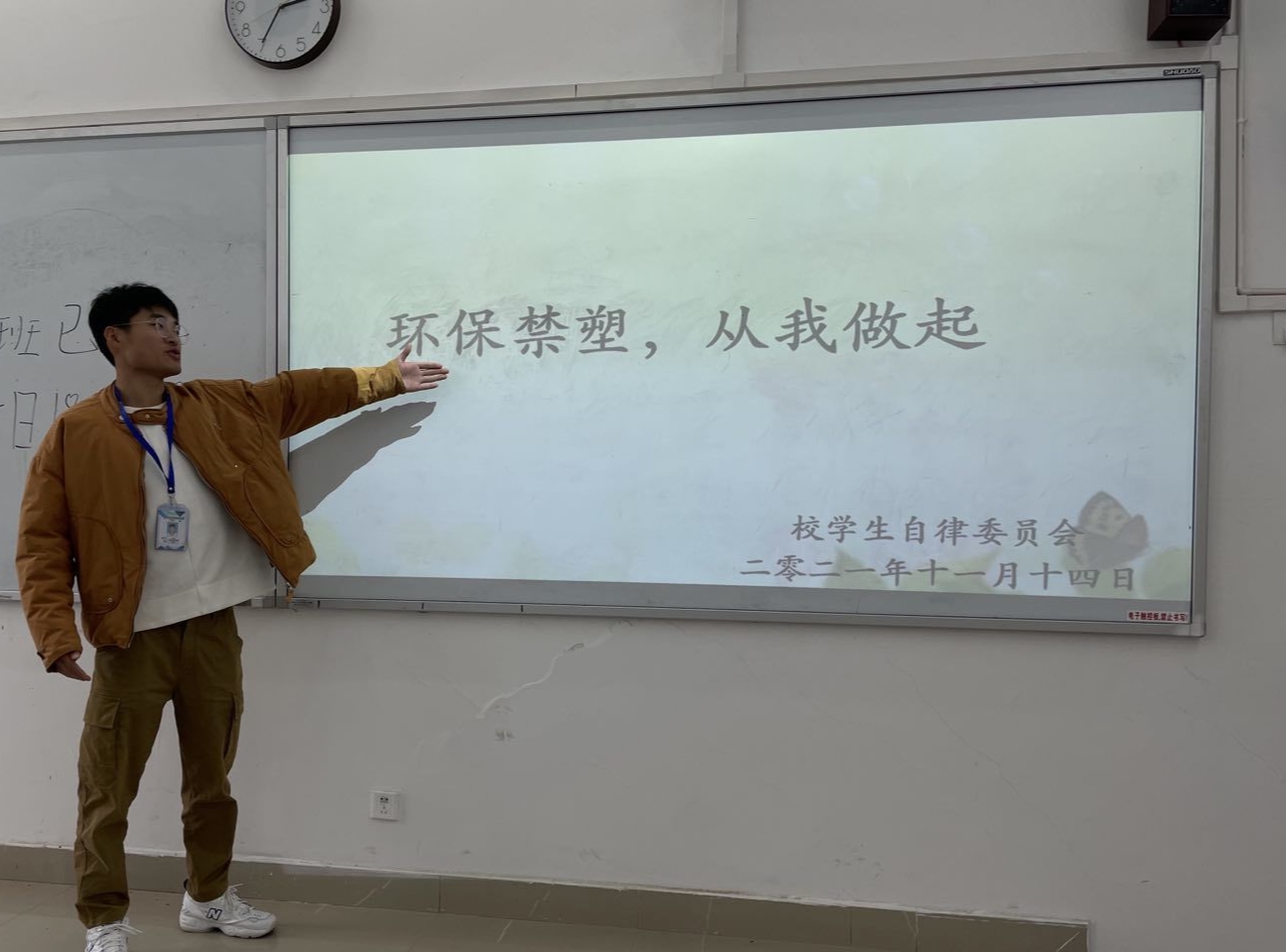 随后,学生活动自律部部长陈豪于树人楼A202教室为参加此次活动的学生干部进行以“环保禁塑,从我做起”为主题的禁塑知识宣讲。他从:什么是塑料、塑料的危害、我们应该怎样减少塑料的使用三个方面让大家更加清楚地了解到塑料垃圾对环境的危害,并希望在座学生干部将“禁塑”理念、绿色生活方式传递给身边的每一个人,为保护校园环境,营造绿色、健康的家园贡献自己的力量。