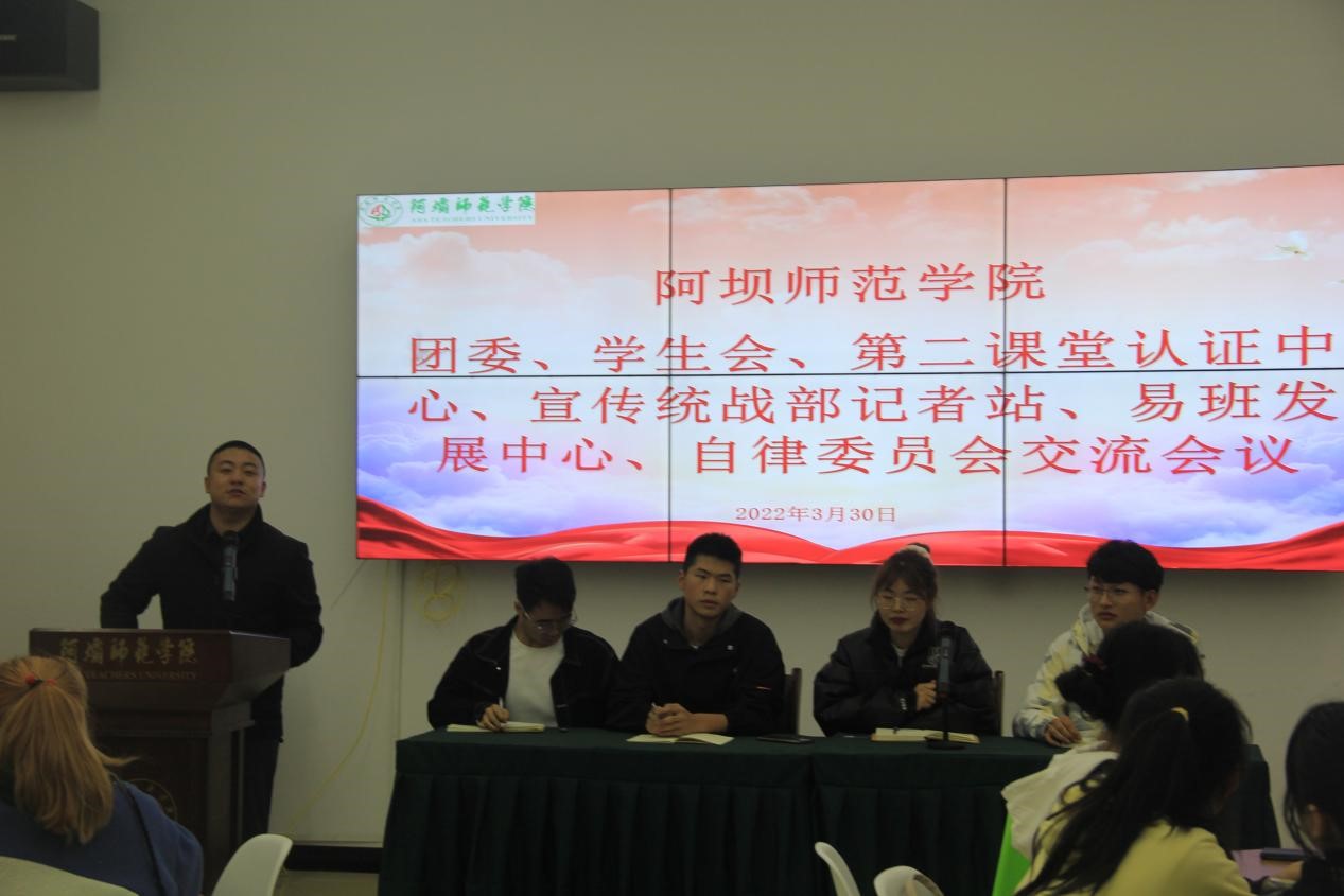 【本网讯】 2022年3月30日,校团委、校学生会、第二课堂认证中心、宣传统站部记者站、易班发展中心、校学生自律委员会于树人楼B105举行学生干部交流会议。旨在为促进各校级组织互相交流,完成学校各项工作安排。本次交流会由校学生自律委员会主席团主席卢智主持,参加本次会议的有阿坝师范学院易班发展中心负责人张宇、校团委副书记王仕杰、校学生会主席团代表肖雪梅、第二课堂学分认证中心副主任洪斌斌、广播站站长谭瑞等主要学生干部。