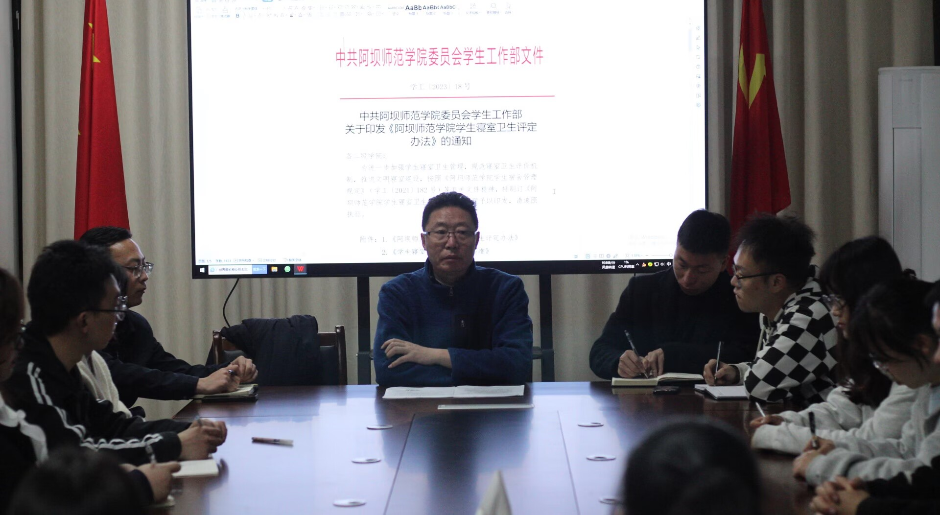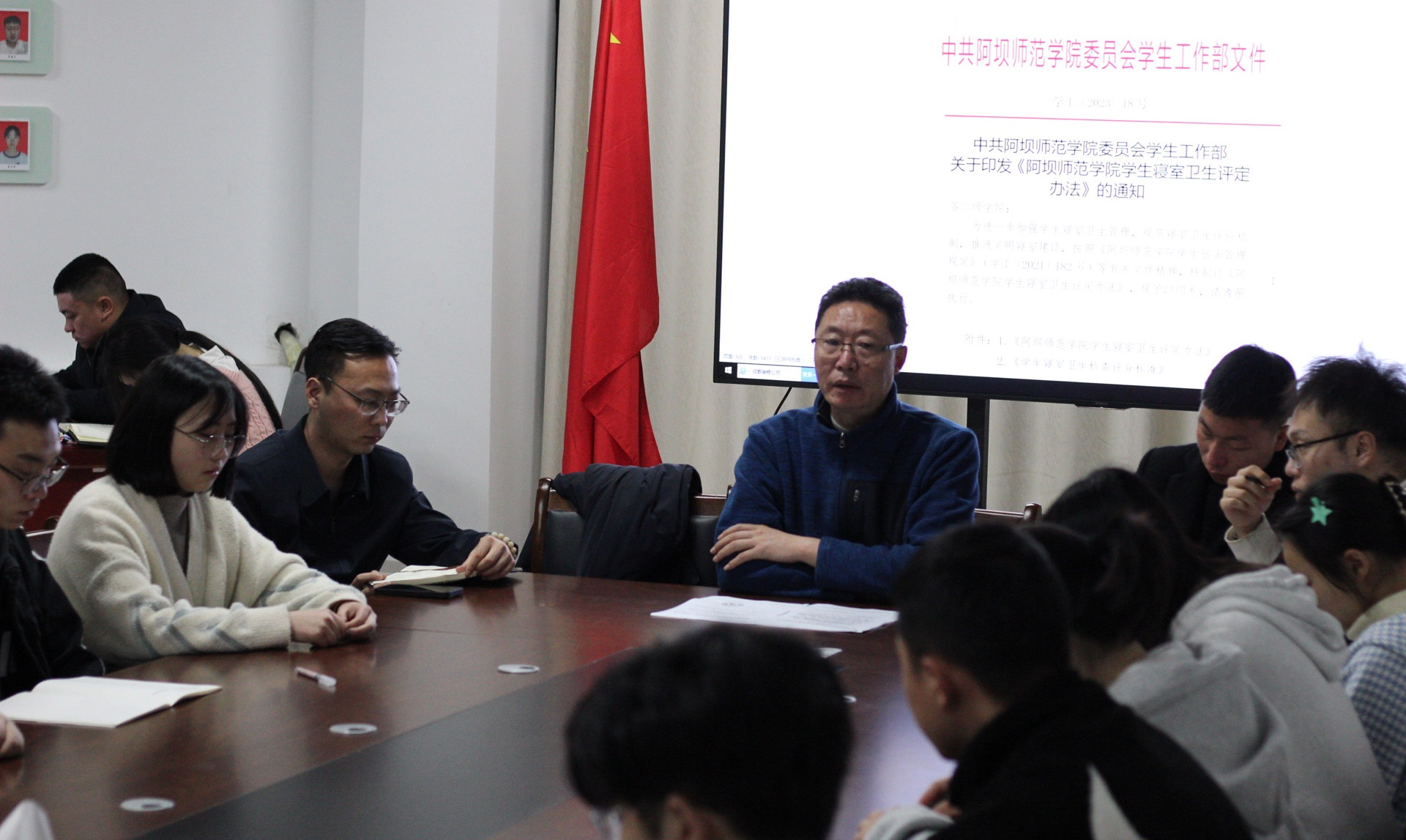 【本网讯】为了学习宣传贯彻党的二十大精神,落实“立德树人”根本任务,促进学生公寓党员工作站之间的联系, 2023年3月9日晚上21时,学生工作部部长罗清杨在学生工作部办公室召开会议,王林波、王新建、郑景文及各公寓党员工作站站长参会。