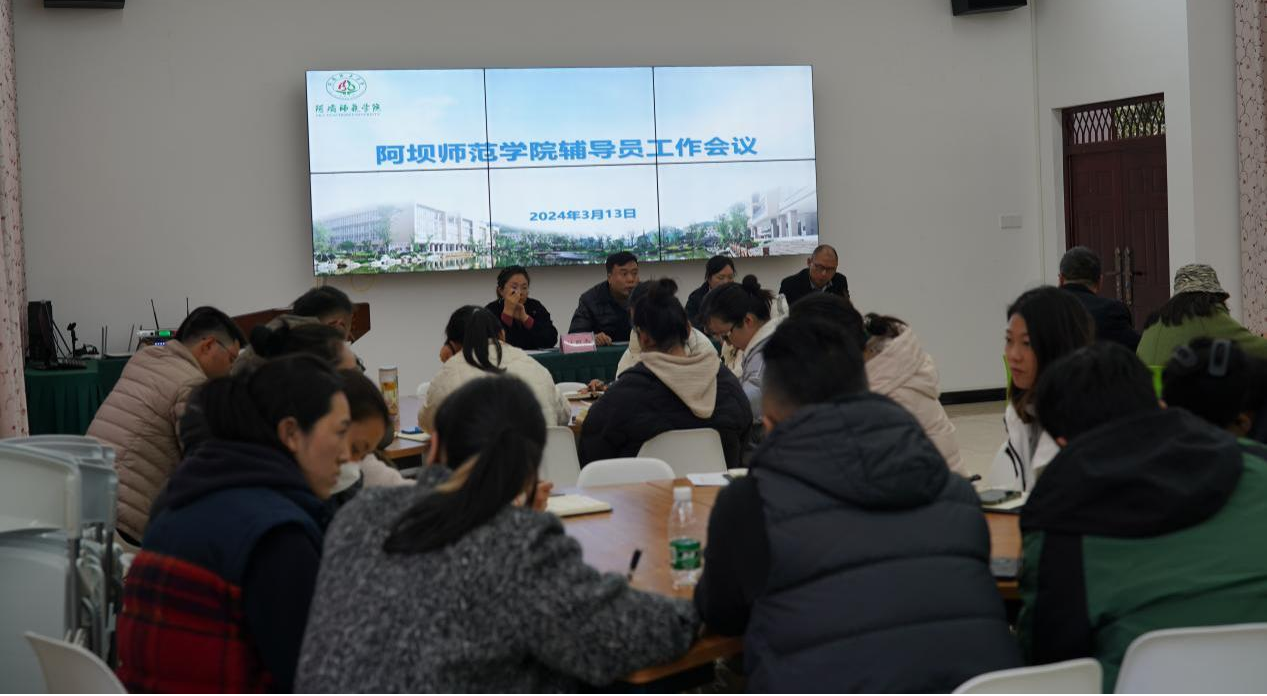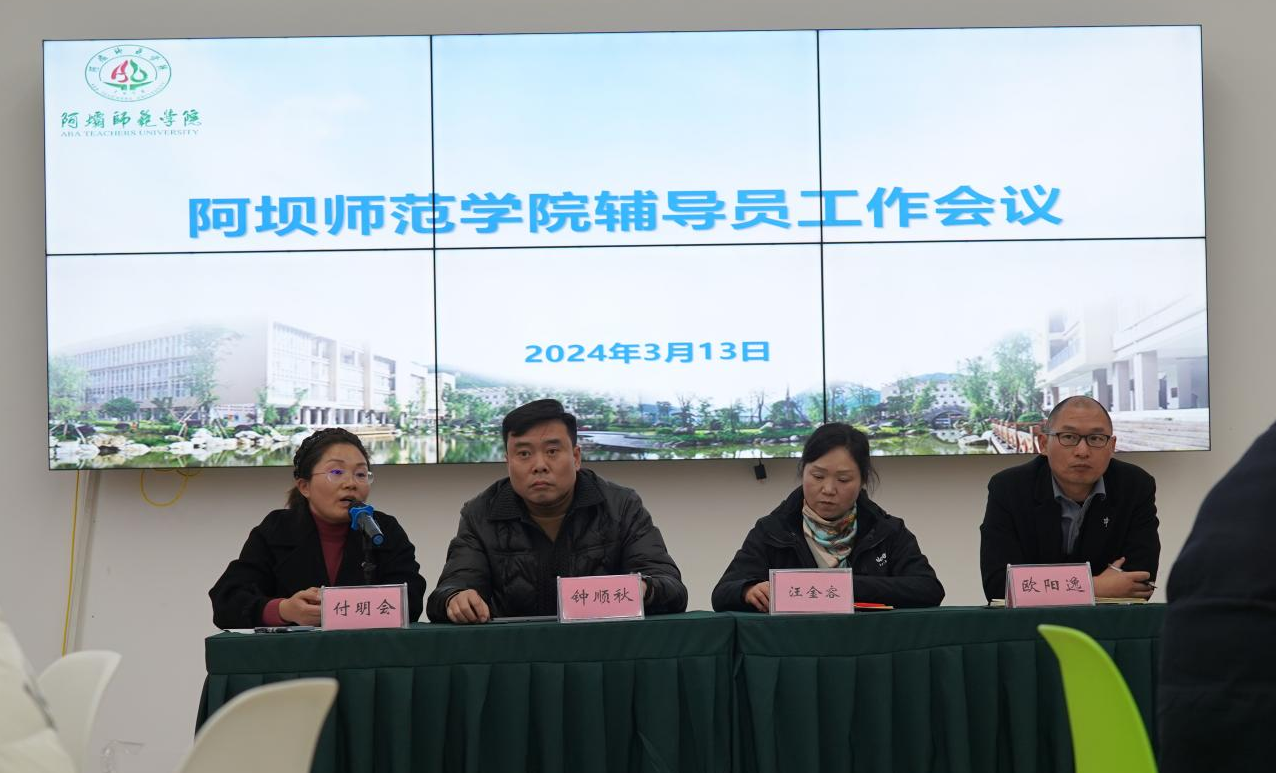 【本网讯】为保证阿坝师范学院工作顺利进行,我校于2024年3月13日16:40在树人楼B105召开阿坝师范学院辅导员工作会议。党委学生工作部部长钟顺秋,党委学生工作部副部长、学生就业创业指导中心副主任汪金容,学生资助中心办公室主任付明会,大学生心理健康中心老师欧阳逸以及各二级学院辅导员出席了本次会议。